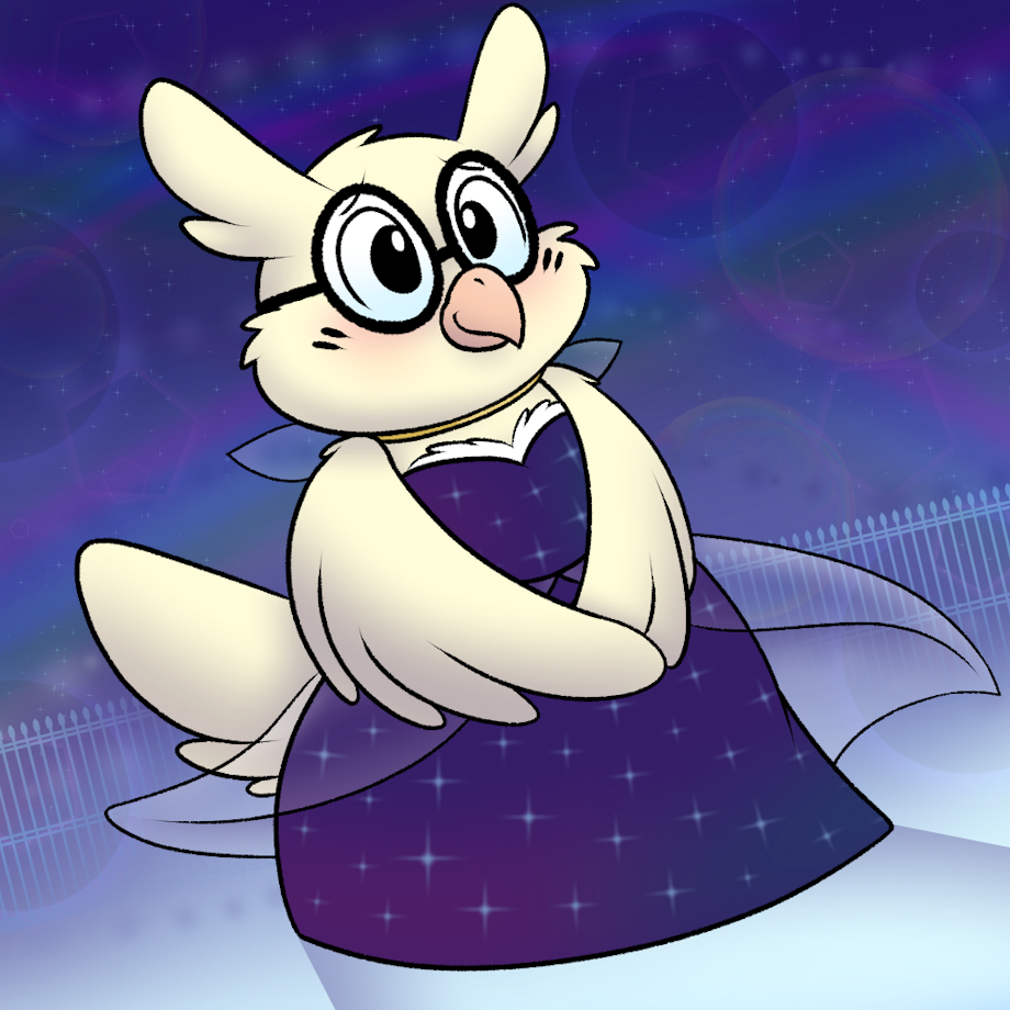 Hoo, I realized I have not yet drawn Owlnard in a dress! And well, it's not required, but with how often Oxnard has crossdressed, there's probably that and other things I could draw Owlnard doing as well! I was inspired by a pretty blue dress I saw that had bright stars all over it. I tried to find the image again but I couldn't - so I just made my own! Here's the polite owl, with their usual thick glasses, looking gentle and sweet in front of a dark blue and white background, with light stars and purple rainbows, circly and sparkly effects, while wearing a dark blue dress with smooth white starry sparkles on it. They also have a little gold necklace on, and some transparent fabric flowing around the shoulder and waist of their dress. Since Owlnard seems more gentle, I think some thing nice and pretty and feminine suits them as they explore their feminine side.