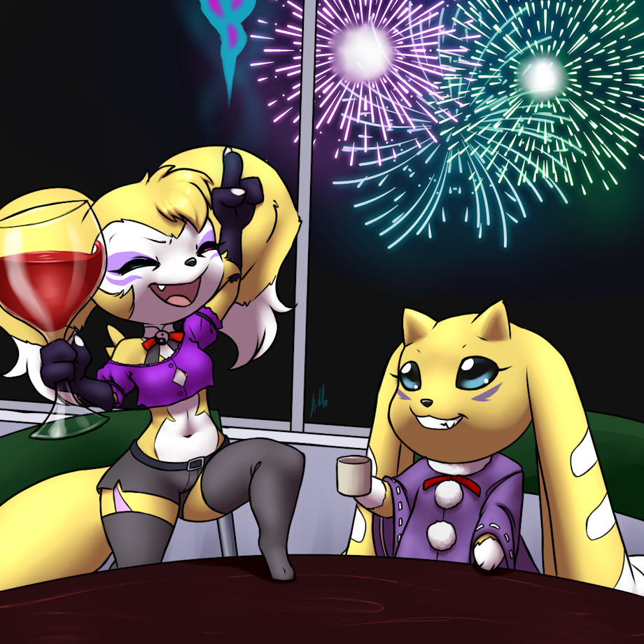 Stream commission for thegantian, of Reni and Fen enjoying the new years at a local bar. After some drinks, the same thing happened this year as it has in prior ones: setting off fireballs indoors. Happens every single time. Why she keep getting let in? lol