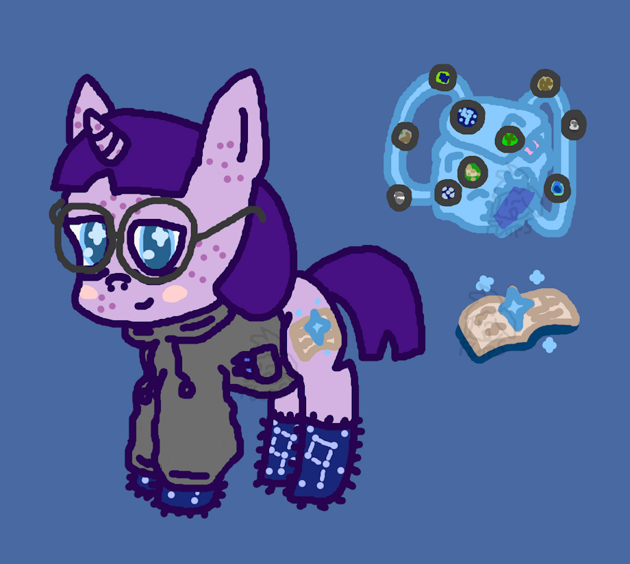 she has a different cutiemark here which is basically my concept for what her cutiemark might have been if she wasn't the fated leader of the elements of harmony. it represents her studious personality and her love of stars. I also gave her a big backpack stuffed full of supplies. i can attest to the fact that studious students never have enough equipment and our bags look like this XD. it is an old but sturdy bag which has even been patched up but still going. there is a pink ruler sticking out coz everyone seemed to have those pink rulers when i was at school lol.