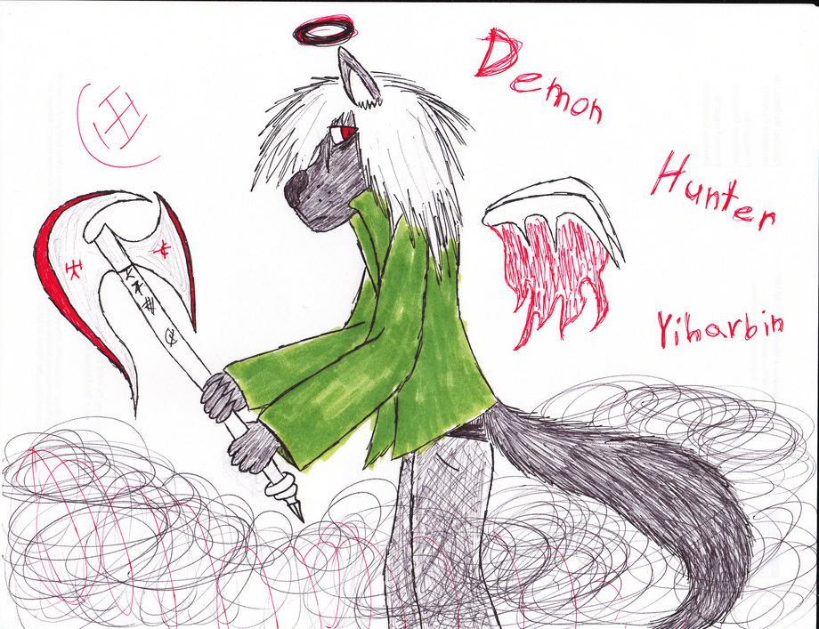 yiharbin is suposed to slay demons... so... I thaught it would be cool, drawing him using his axe to kill a demon, split it down the middle or something.... sooo... thats what I drew just that ^^;