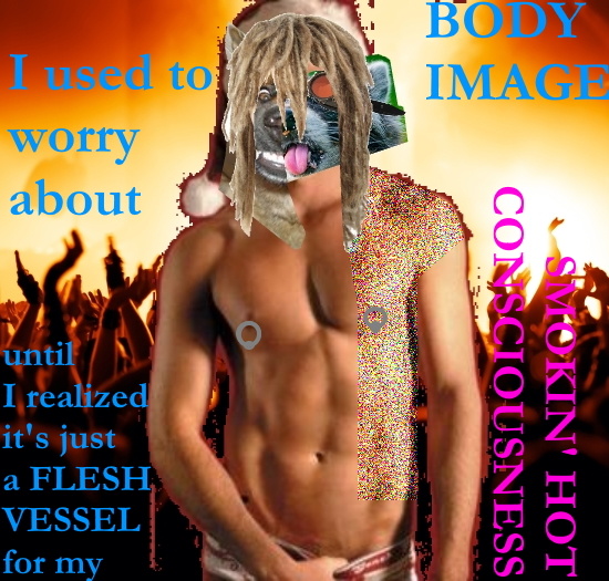 An old meme I created for FA back in the day. The fandom once wondered how everyone's fursonas would look in a scrapbook-like realistic portrayal. So I took a little raccoon, some german shepherd, goggles in place of an eyepatch, mouse-drawn MSpaint nipple rings, a dread-headed wig, a gradient tool, a photo of a random rave and a hunky male model in a Christmas advert and spliced it all together to create...