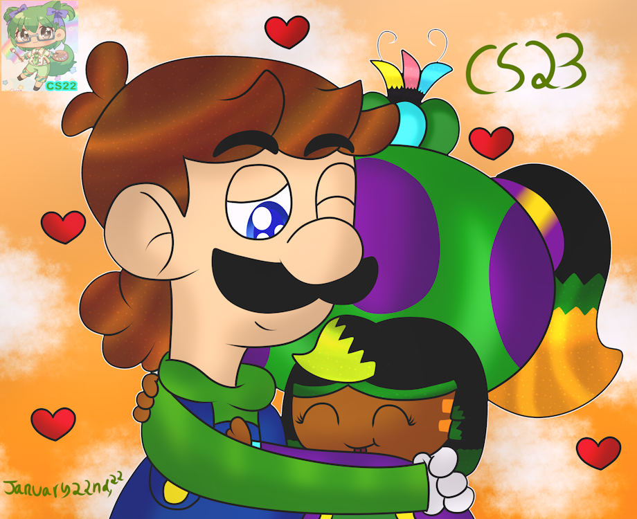 Anyway, in this drawing. Cole And Luigi was on a date, while they was on a date. The sun start to go down. It was sunset. And A few moment's later. Luigi came in a started to hug Cole. During the sunset. And they have little hearts around them. ^^ Yes I know, a toad dating a human. hehehehe ^^