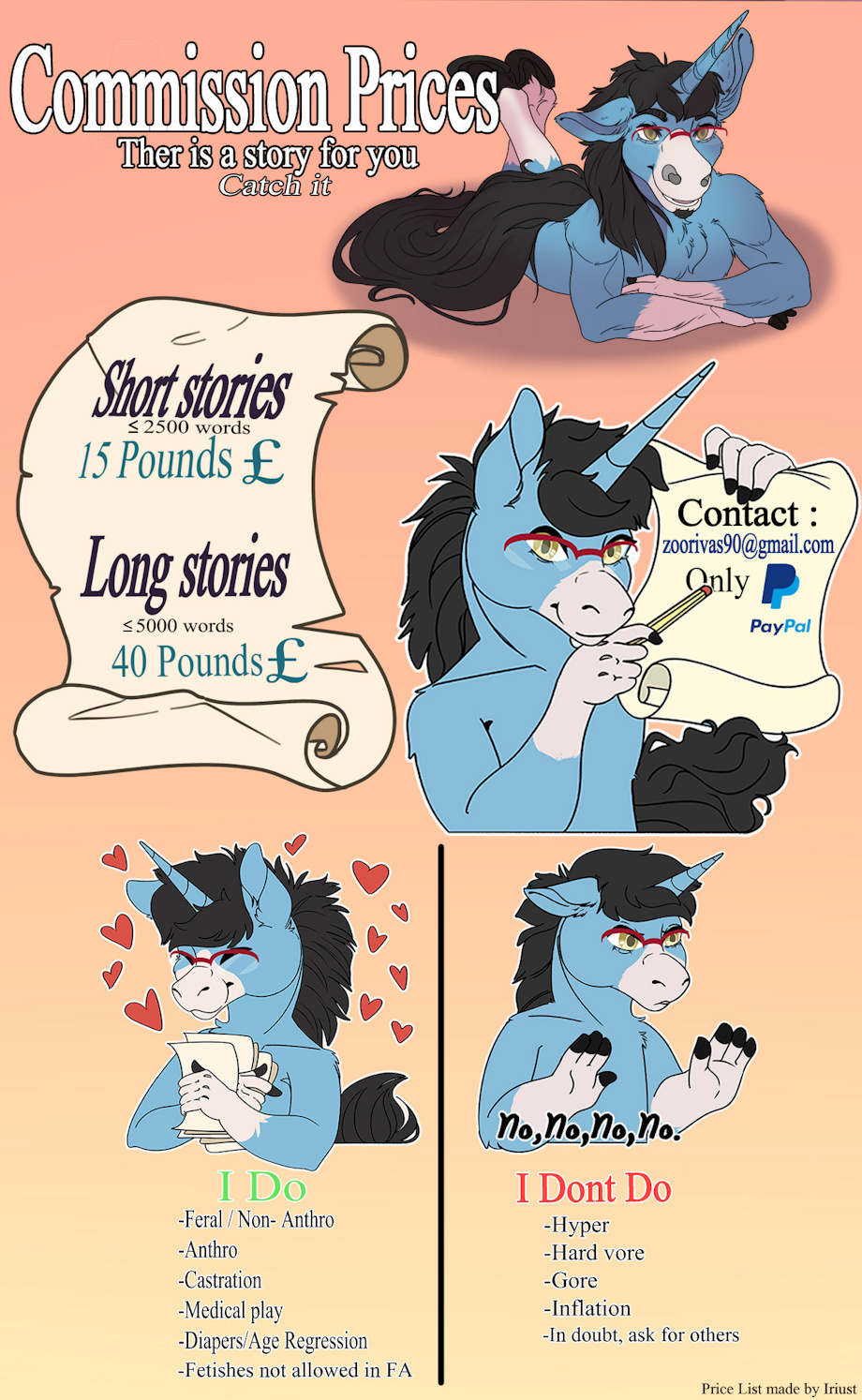 Hi folks! I'm ready to write whatever you want, just contact me and we can arrange the details. By the way, if you're asking, yes, I do erotic cub stories too.