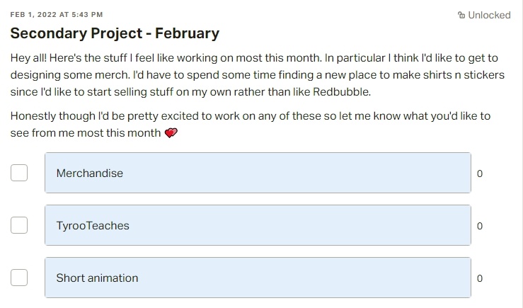 I've opened voting for this month's side project on Patreon. After the latest changes to my tier format $2 patrons are now able to participate in this vote and have an influence on the content that I'm putting out 💕 make your voice heard!