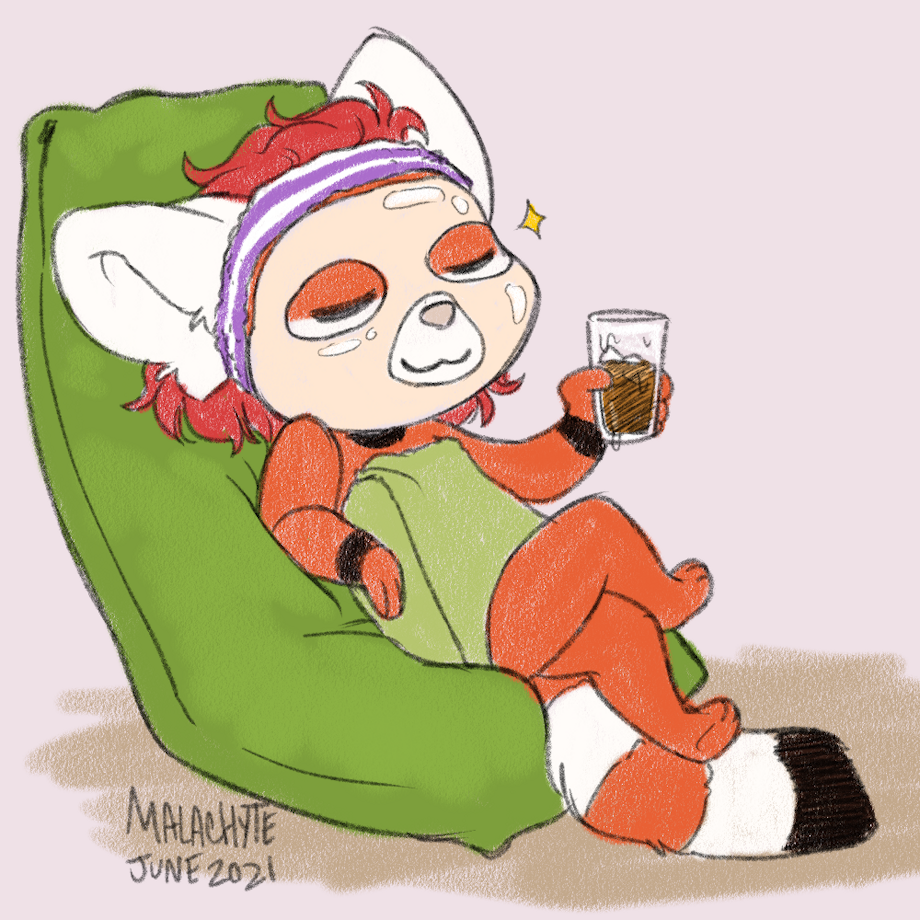 Originally drawn June 2021. I remember I treated myself to a super chill self-care day, where I had some homemade cold brew coffee, a fancy face mask and a big ol' yogibo bean bag chair. It was a great day off~ I still do things like this to relax when I feel burnout looming on the horizon.