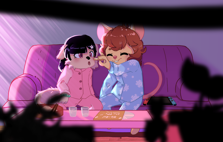 is feeding Jiao Jiao some crackers with cheese on it, while the doggo puppy prepared some bao buns on the side. Jiao Jiao's dad is totally gonna chastise them for eating right before bedtime, but I guess she doesn't care as much when the mousie's over for fun!