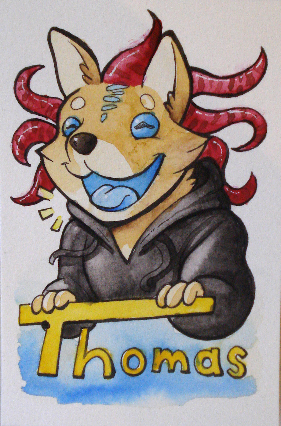 Badge commission for Grey (I don't know his FA info though. quq"), done at CanFURence 2021, of his character Thomas!