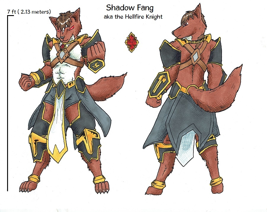 Shadow Fang is a proud, and noble warrior,he is always willing to take htis for others and protect those in need,a warrior for justice he will always try and do what is right,but you wouldn't guess that beyond his imposing form he is one of the kindest and gentlest souls around,in reality he would rather not fight ,but he knows all to well when things are getting bad he will use his strength to crush his enemies, though sometimes a bloodlust will take over posing danger to any around
