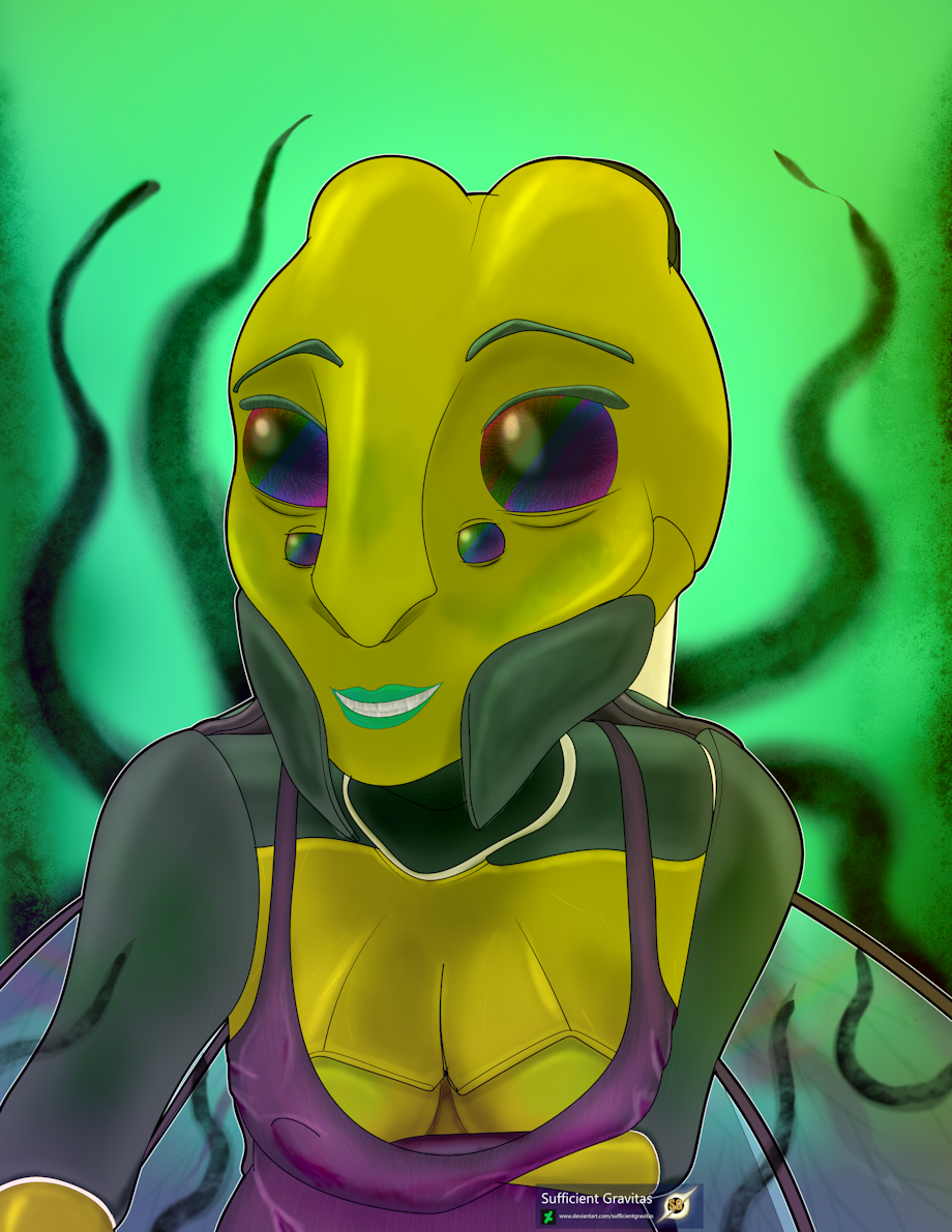 pictured here is Destra, in a dress that shows off her bust very well, and with her swarm deployed for some reason. I guess it makes for a memorable entrance, and it's probably good for a dragon to flex on all the other races, occasionally. what's the point of being a dragon if you can't be the center of everyone's world occasionally, right?