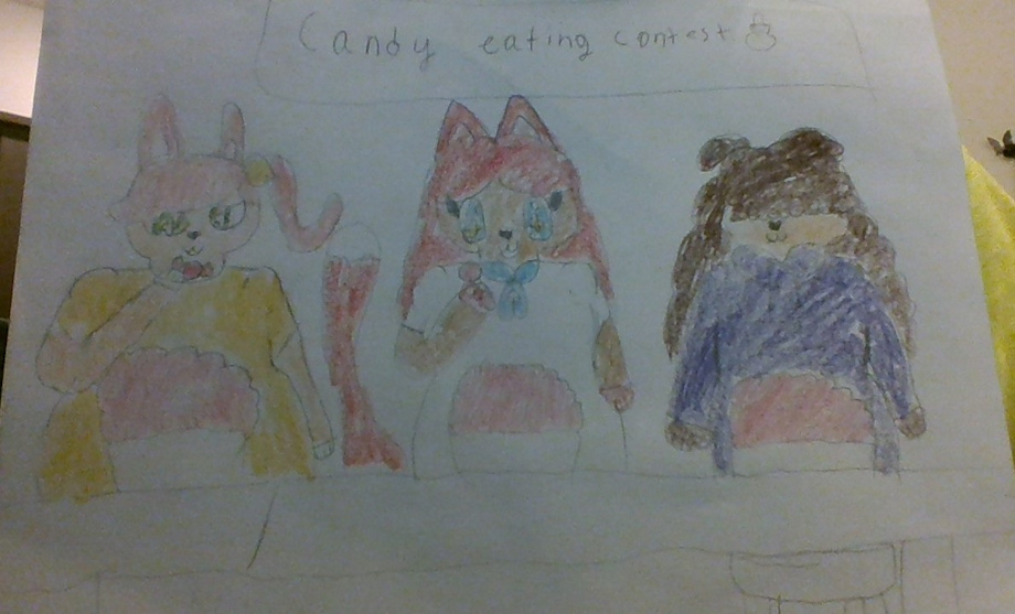 1: So, the young, neko, girl from the Valentine’s Day request Yuri did up for me is back and is in an eating contest with a couple of other girls her age. Instead of just cupcakes, however, there’s a whole assortment of candy for these kids to enjoy. It’s the perfect contest for a chubby, hungry, candy-loving, little, neko like her ^^