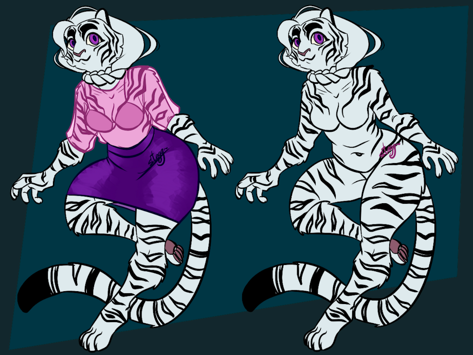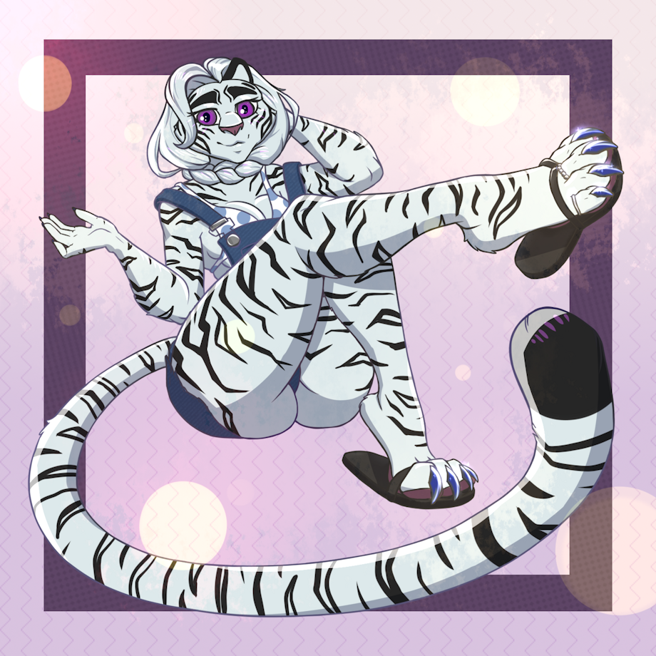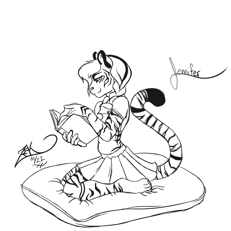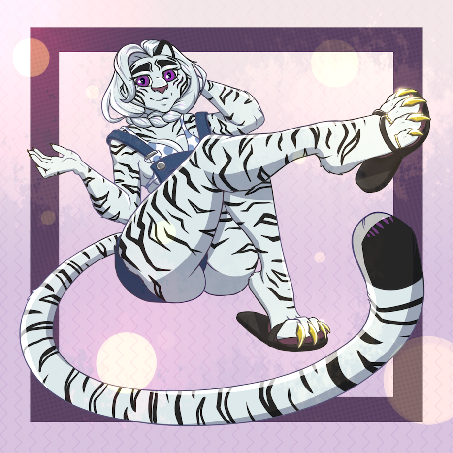 A gorgeous drawing of my lovely tiger girl, Jennifer done by :iconTimelessness1:. They did a really good job on this! I love how calm and relax Jenn is in this posed sitting like that while her flip-flops lossly hanging off her feet with her toe rings in desplay. Almost like she's showing off her feet without being in you face about it. I also like how nice she looks with this outfit she's wearing which is a bikini with overalls.