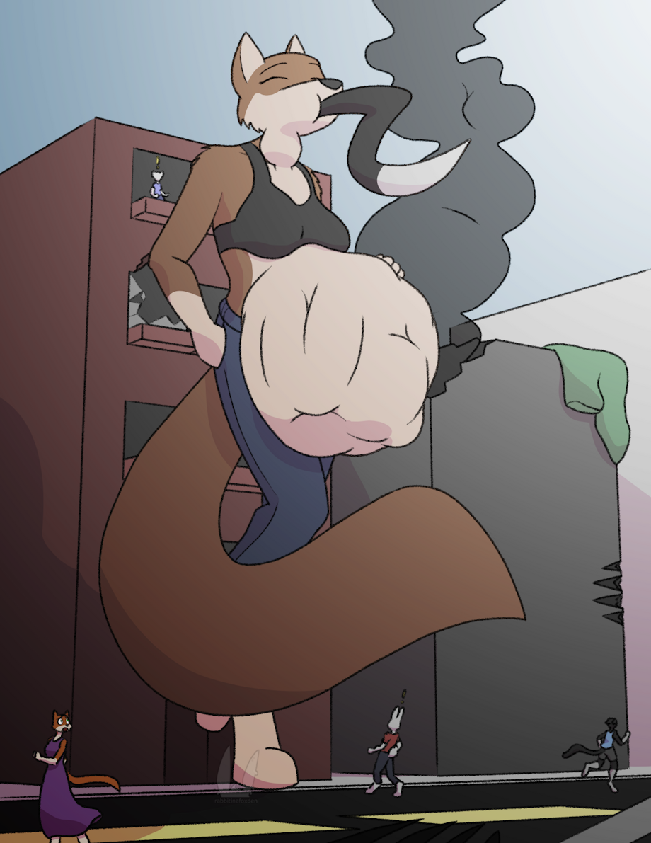 Then the wolf pulled away, turned around, and leaned back. The building shook again as she pressed her back against the partially-destroyed wall, letting out a satisfied moan as she cupped her gut with both hands.