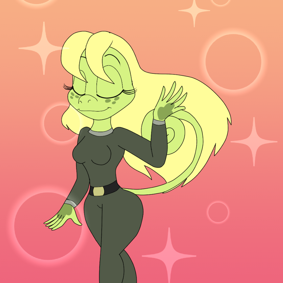 Here's Camilla, the Chameleon's sister, in her normal outfit and her hair down. Oh my! She just flipped her hair!