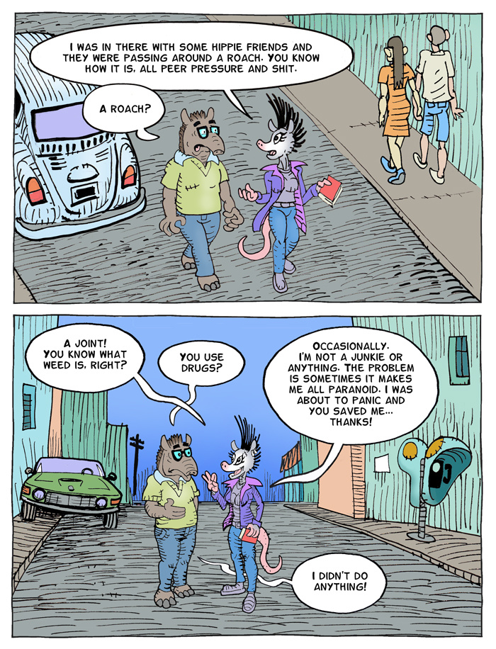 I just finished the first episode, with only an hour left of my medical leave. I'm glad I can post it before taking a shower and going back to work. It may not look like it, but these pages took a lot of work. I struggled over lots of tiny details there. I'm especially happy with the movie theater scene.