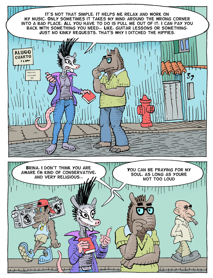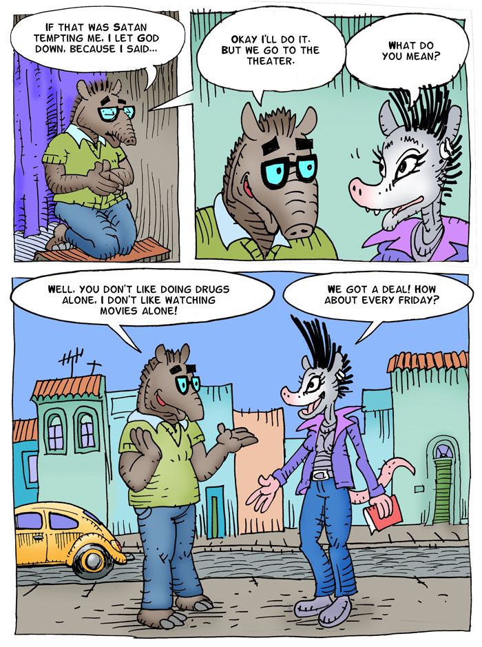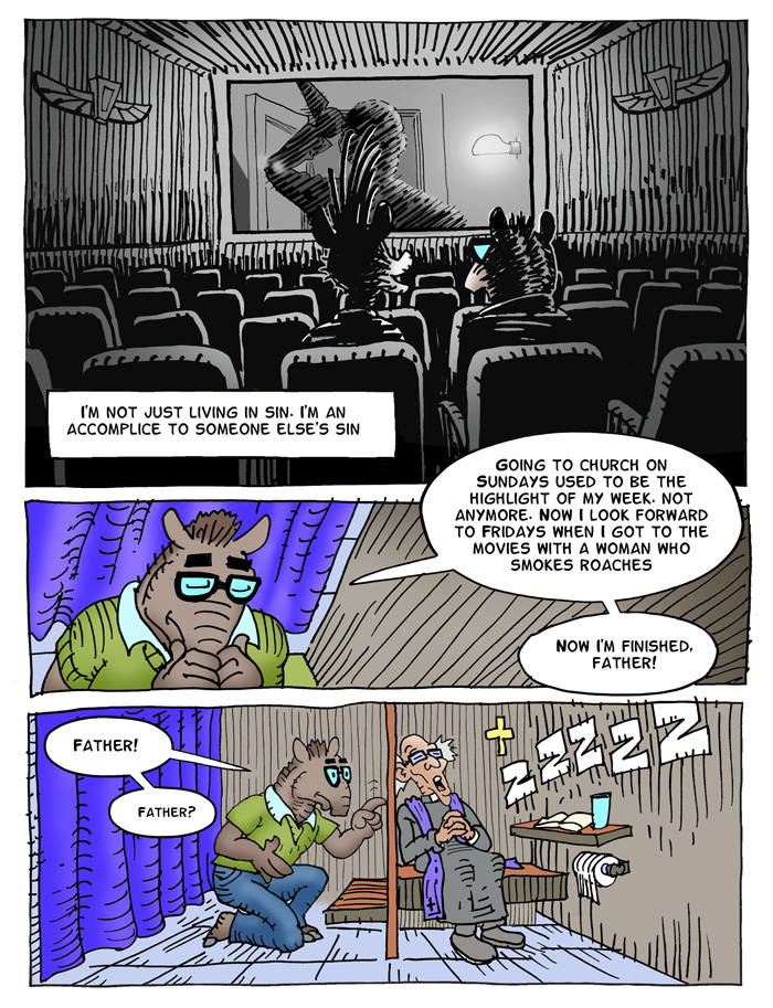 I just finished the first episode, with only an hour left of my medical leave. I'm glad I can post it before taking a shower and going back to work. It may not look like it, but these pages took a lot of work. I struggled over lots of tiny details there. I'm especially happy with the movie theater scene.