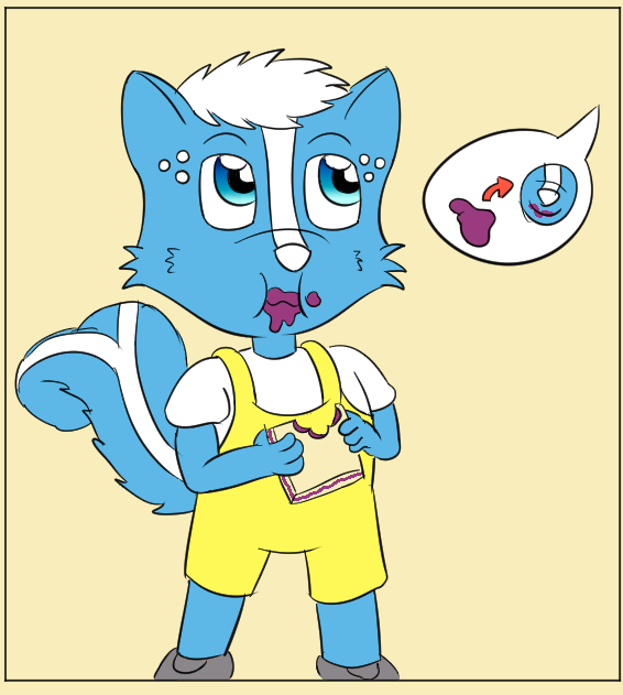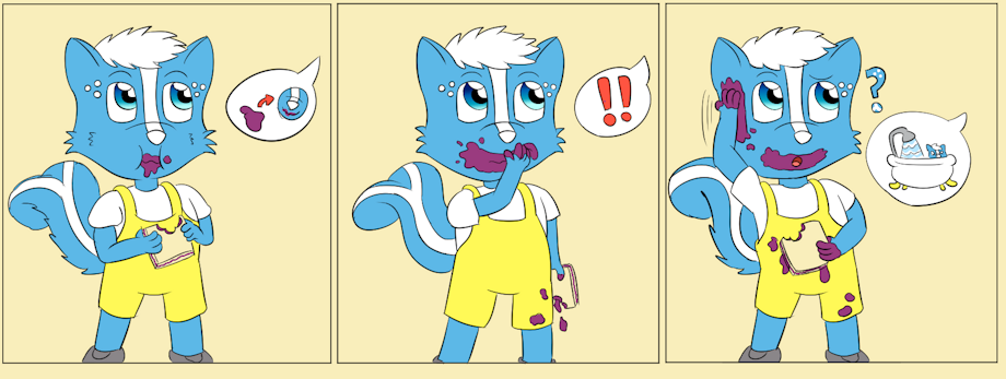 Here Gussy got a Jelly sandwich, and as Annie tried to tell him he had a bit of jelly around his mouth, he tries to clean it up just to spread it way more. And way more then. guess it's a good time for a bath. Wonder if there'll still be a blue skunk by the time he finish the sandwich, or if he'll get all jelly