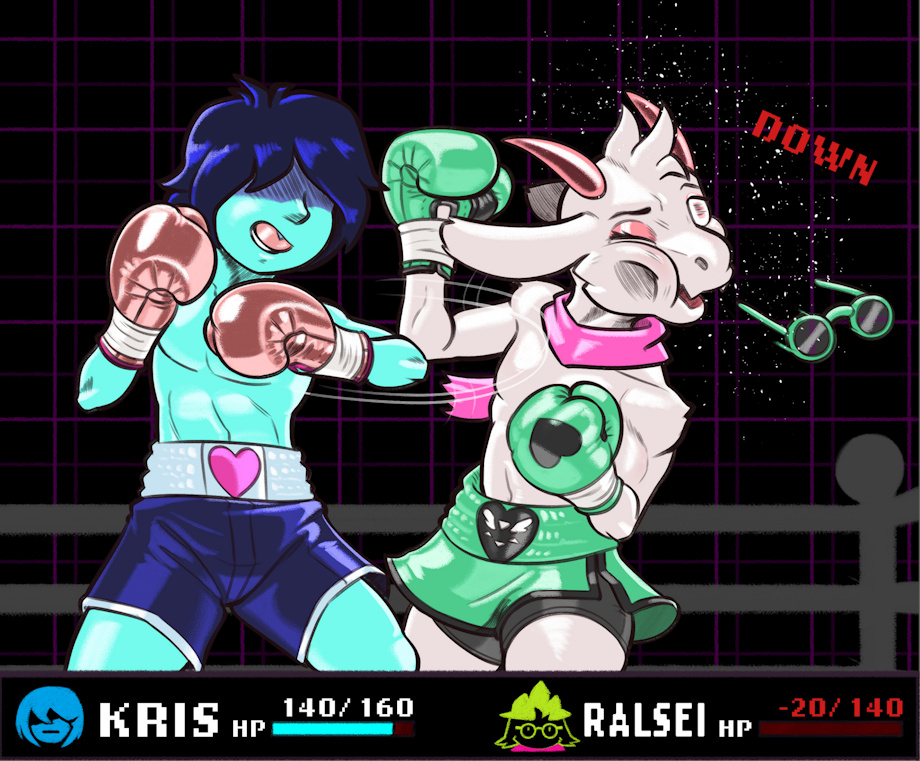 featuring a male Kris landing a hook on Ralsei, both from Deltarune.