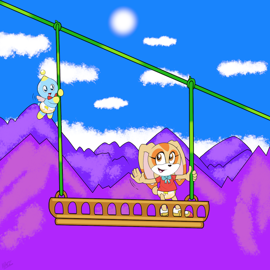 Baby Cream and her Chao Cheese riding down the Vine Gondola in Violet Valley Zone.