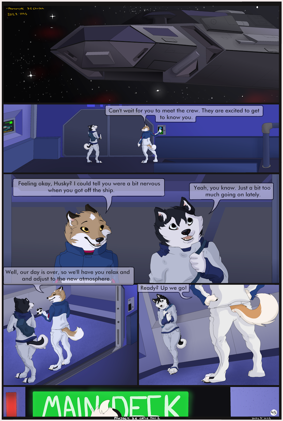 Husky just barely arrived at the Prototype D.E Cruiser Ship, and I'm sure he's ready to perform his duties as a test pilot. Poor Husky doesn't look to happy, as he is is not used to being outside Canis Major, but let's hope he manages to adjust eventually. Meeting his new friends will surely help with that.