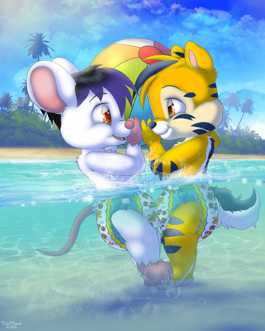 You'd think we'd learn our lesson from this pic. Yet here we are. Sid Mouse and I playing at beach, not aware what's slowing us down while hitting the beach ball. Trying not to let it hit the water, we caught it at the same time. However we figured why we're so slow. Water filled padding stopping our collision. ^^;