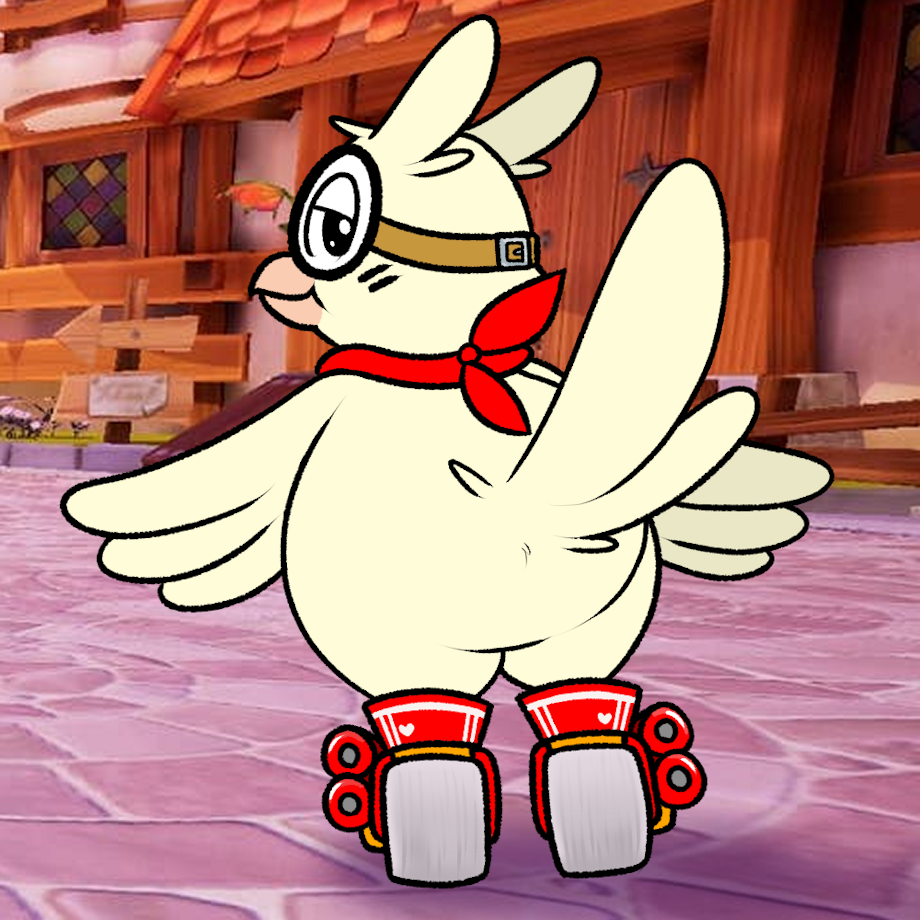 Visual Description: Owlnard from behind! The background is just a screenshot from Chocobo Racing's town (I think it's called Alexandria?) from Final Fantasy 9 - all purple-red-pink colored with cobblestones and town homes like in the game! But anyway, Owlnard is looking back with lowered eyelids - wearing a red bandana around his neck, his big thick glasses are strapped in the back like goggles, and he has on cute red and white skates, with large white wheels and red rockets on the side. His tail feathers are up, wings out, just a hint of featheriness around his butt as he shows it off under his big tall tail feathers!