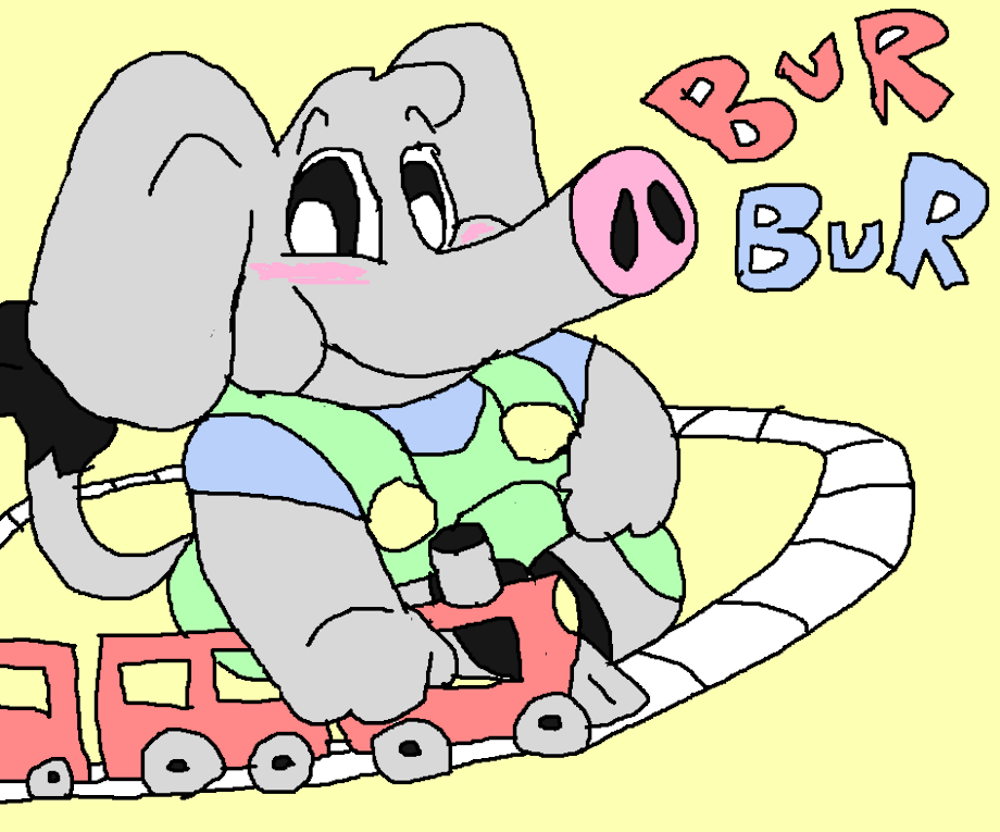 Tyler absolutely LOVES trains (like I do IRL) and here he can be seen playing with one of his many toy trains making whistle noises with his trunk. He loves his trains very much and makes sure they get lots of love and care and playtime. Choo choo! X3