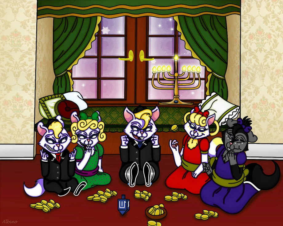 A Hanukkah Picture for the Holidays of all 5 of Cain & Chilla's Children Playing a game of Dreidel in the sitting room during there Hanukkah festivity's while there mom & grandma Cooked the Hanukkah food & cain sat in the room & watched his kids play. Adolf, Isac, Easter, Noya & Aria. are all eager to win one of there favorite holiday games.