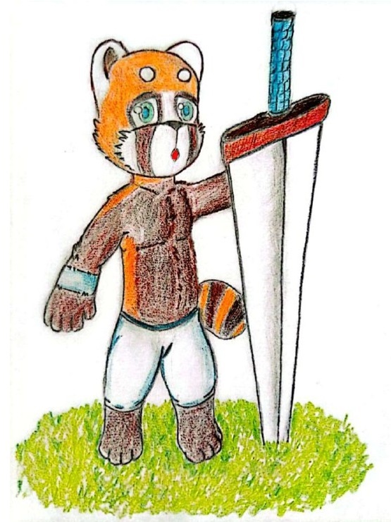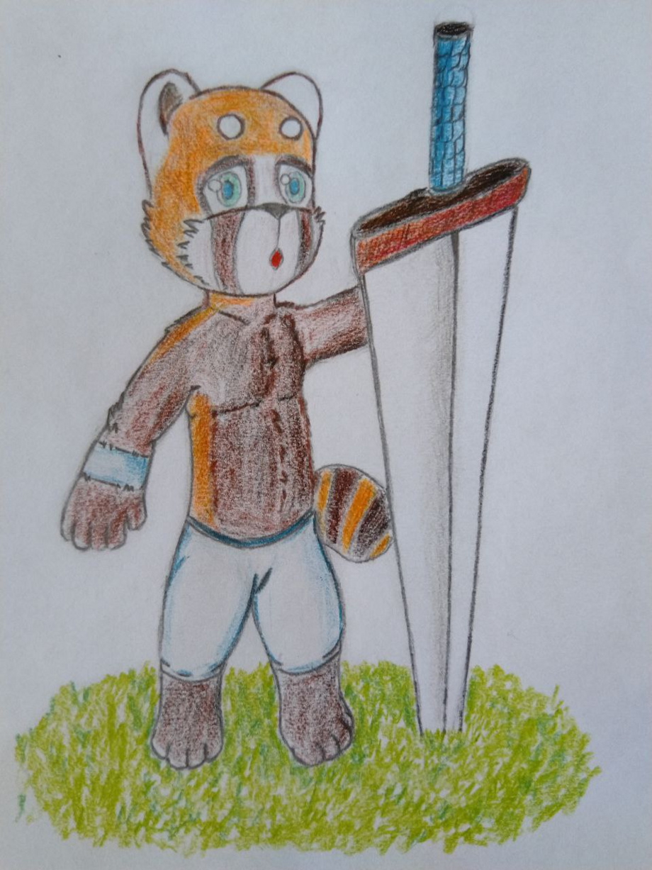 An original tanuki boy, hiding behind an adventurer's sword.