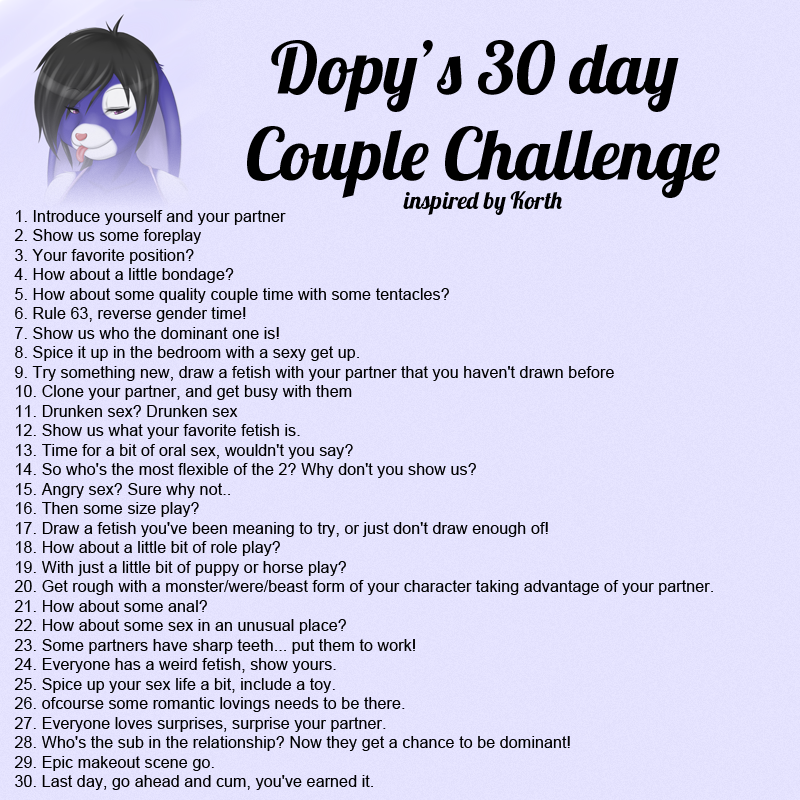 showed me korth's 30 day porn challenge we both got a bit upset, alot of these challenges seemed really fun to draw, but alot of them were against our principles, therefore I decided to make my own version of the 30 day challenge, turning it into a challenge for coupled furs to draw lots of indecent stuff with their partner.. >3>... enjoy.. I suppose