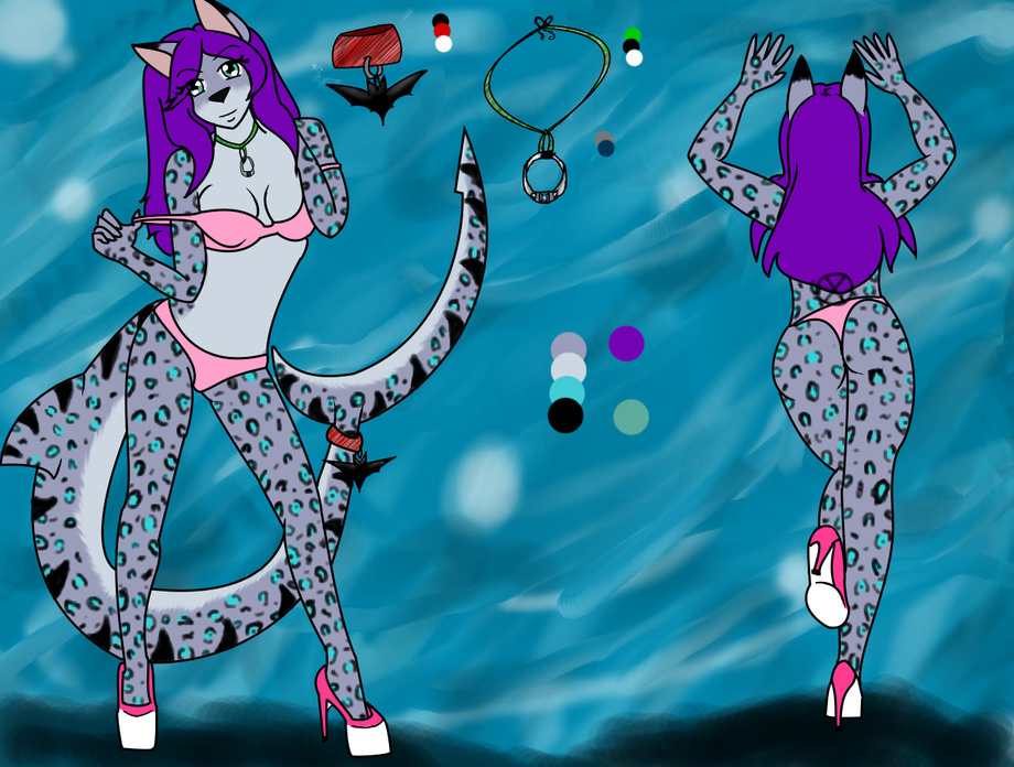 She has a blue grey fur, with a light blue grey underbelly that covers her neck and lower part of her face. Her marking were that of a snow leopards though the spots were colored turquoise. she had long flowing dark purple hair and a blue green color iris. Subtle lips and a large rump her body was curvaceous and her legs are long. Her bust was 32 DD. Usually she wears a bikini or a sundress her hair is usually always down. She wears a tail cuff with a bat charm and a green woven neckless with a old silver ring with a blue stone.