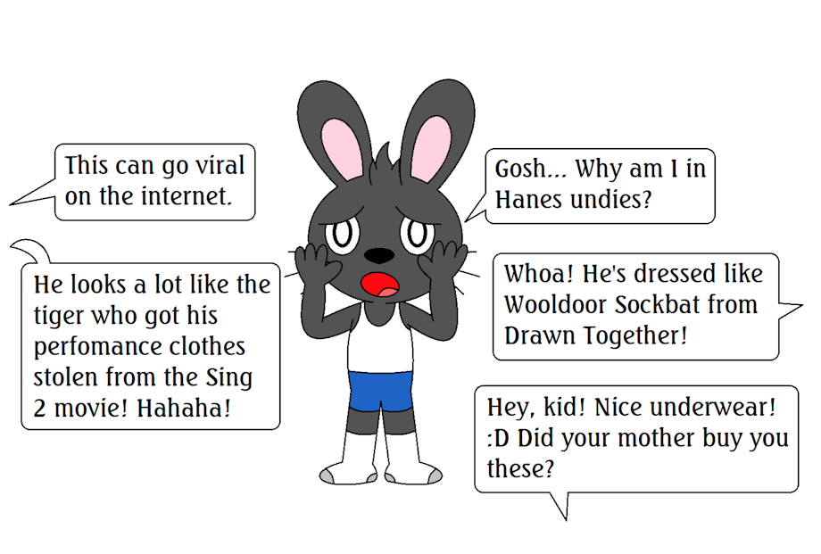 Finally, I finished this picture in no time! Here's Gerald who is a black rabbit and my Adventures of the Little Koala OC and he's in his underwear. People are making fun of him and saying that he looks like Wooldoor Sockbat from Drawn Together and the tiger from the Sing 2 movie.