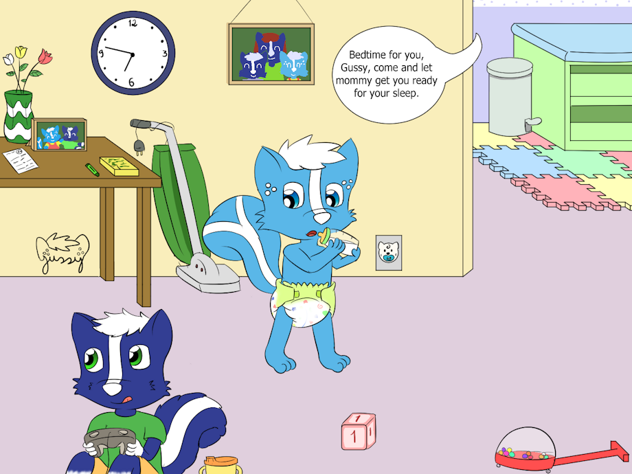 But Gus could notice a few differences... While Annie gave Arthur a sippy cup, he was given a baby bottle. and when the clock shows it's 6:45pm, Annie already calls Gussy to get ready for his bedtime at 7pm. this includes a change for a bedtime diaper, his pjs and a storytime until he fall asleep. Not that he doesn't like it - he's quite used for that routine-, but he wonders why Arthur can stay up way later than him. They're almost the same age phisicall. While Gus is a 4yo, Arthur was 5, having his birthday a few weeks after Gus went to live with them.