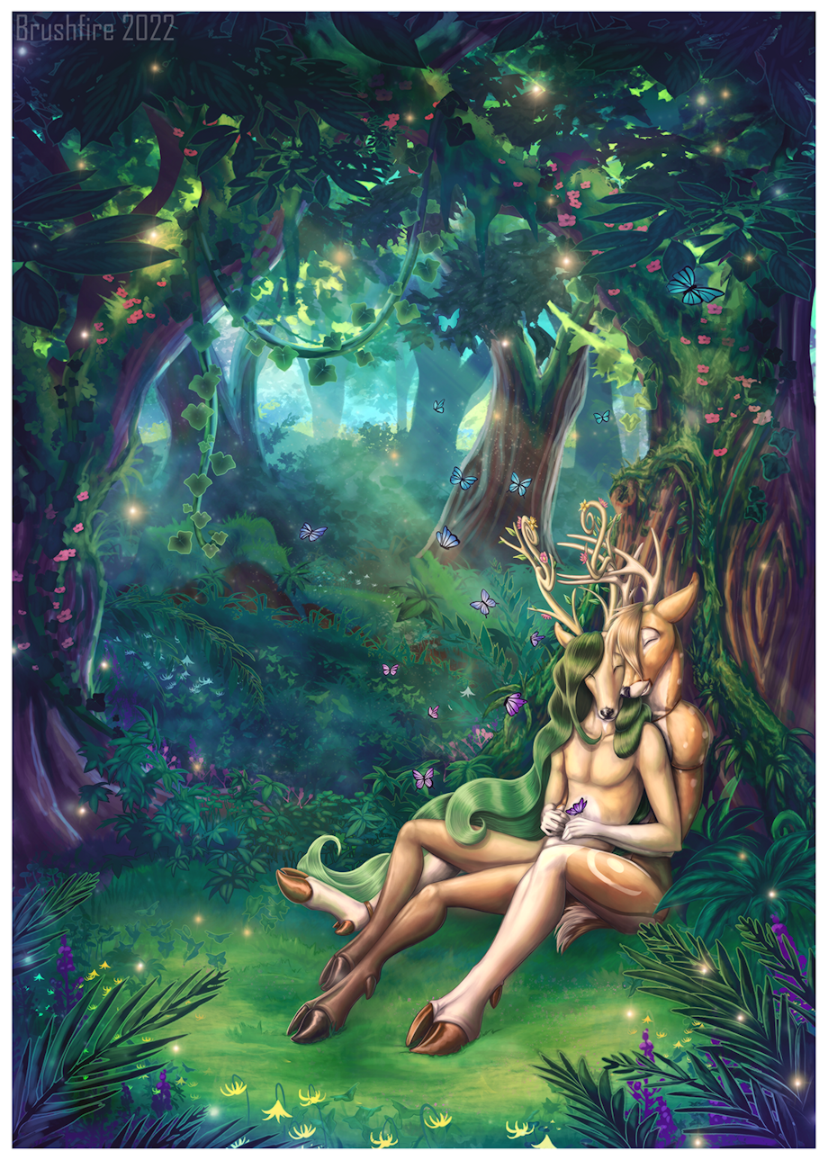 having a nice cuddle in a magical forest.