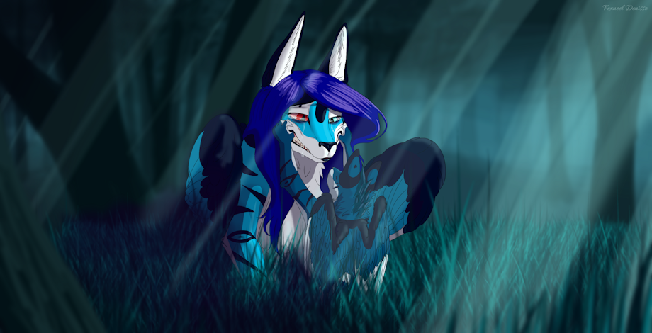 Fexneel se encuentra en el suelo, llorando y anelando el regreso de su hijo (Zerneel) y su presunto padre (Izan). Llorando casi a gritos gimiendo del dolor de su pecho por aquel corazón partido escucha un movimiento brusco en el césped, siente un olor extraño; al levantar su cabeza algo la toma de los lados de su boca y la levanta un poco. Un cachorro azul de Arati, un Aratilupus real.