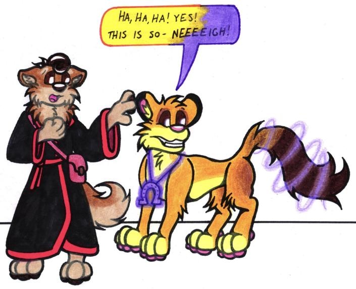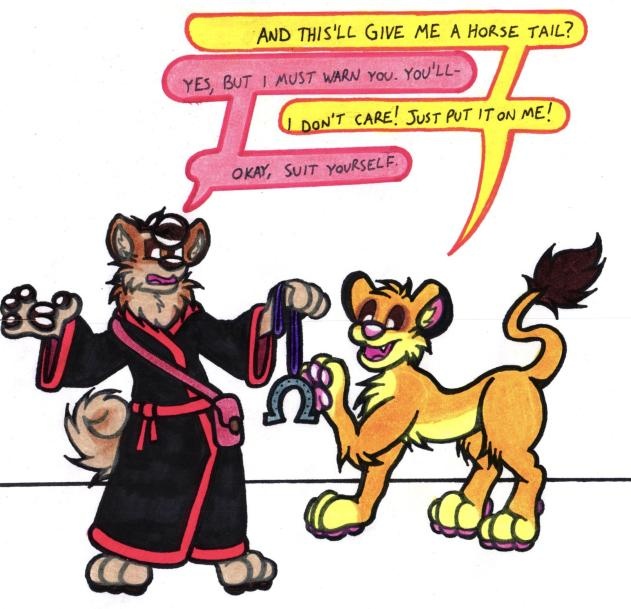 1. Oliver's trying out a new wizard outfit for when he presents artifacts to those curious about transformations. His first "client" is Simba. Ever since he accidentally gave himself a horse tail, he secretly liked it and wanted to keep it.