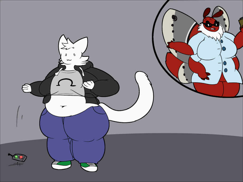 Omega felt these clothes began to be tight and became small. Then he saw with horror that he was fattening. In shock, he dropped the remote control. His belly came out of his shirt, his chest grew fat and those legs too, like everything else swollen because of the fat. The opposite effect produced on the side of Vikki. She lost her chest, just like her big belly. She did not quite understand what was going on. She continued to lose weight. After a while, she had a doubt about what was going on and went straight into one of the lab, where this was Omega.