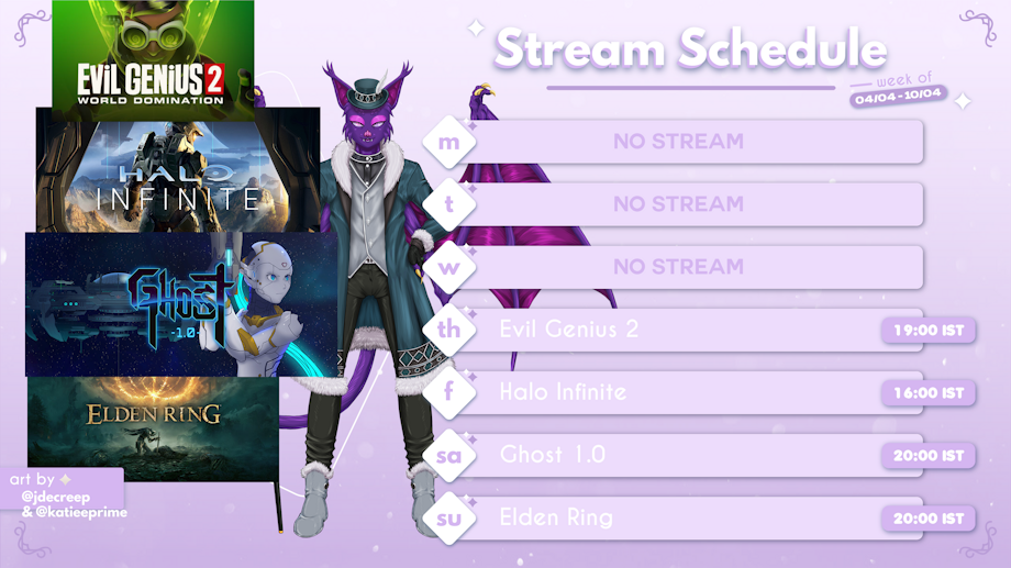 Here's my stream schedule for the week. Deck building in Tainted Grail: Conquest, the final run in Deathloop, fun exploration with Ghost 1.0 & dealing with bosses & letters in Elden Ring.