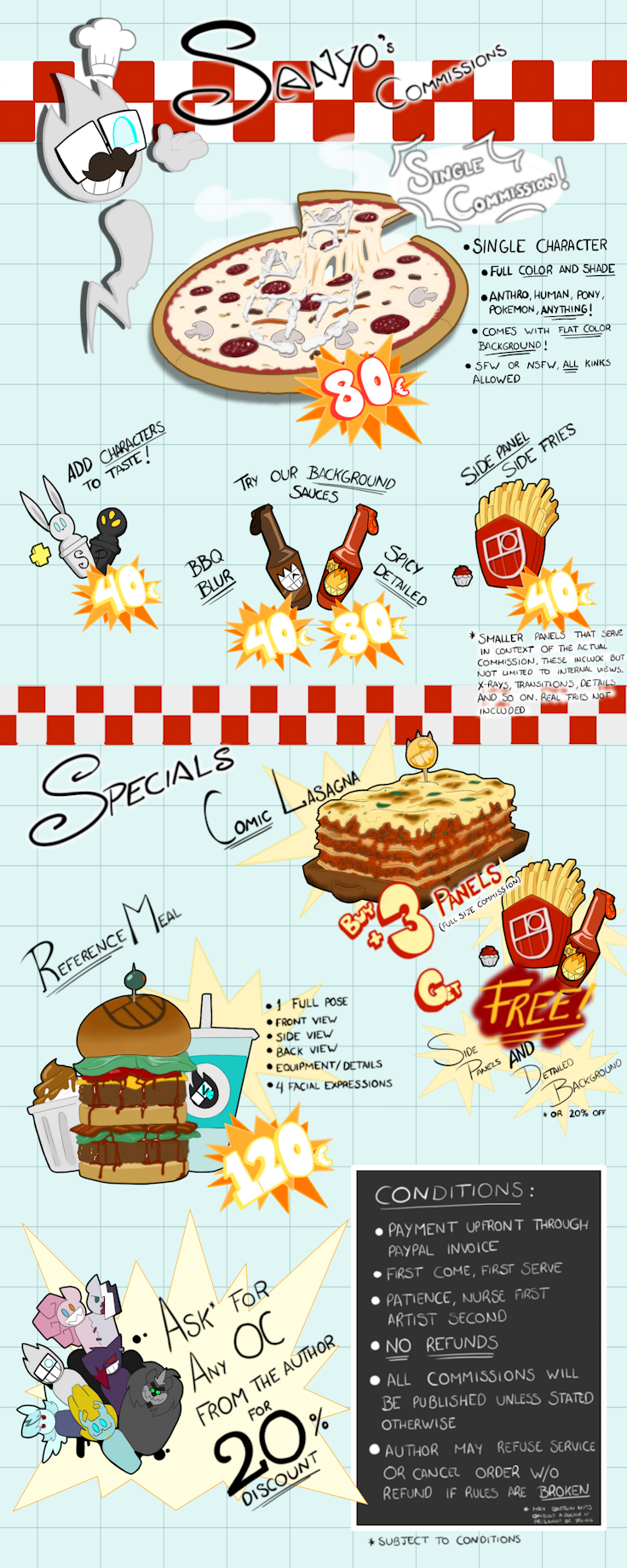 I made some clarifications and improvements on the sheet. The lasagna consist in three (or more) commissions used as panels and comes with FREE side panels and detailed backgrounds (Or 20% off).