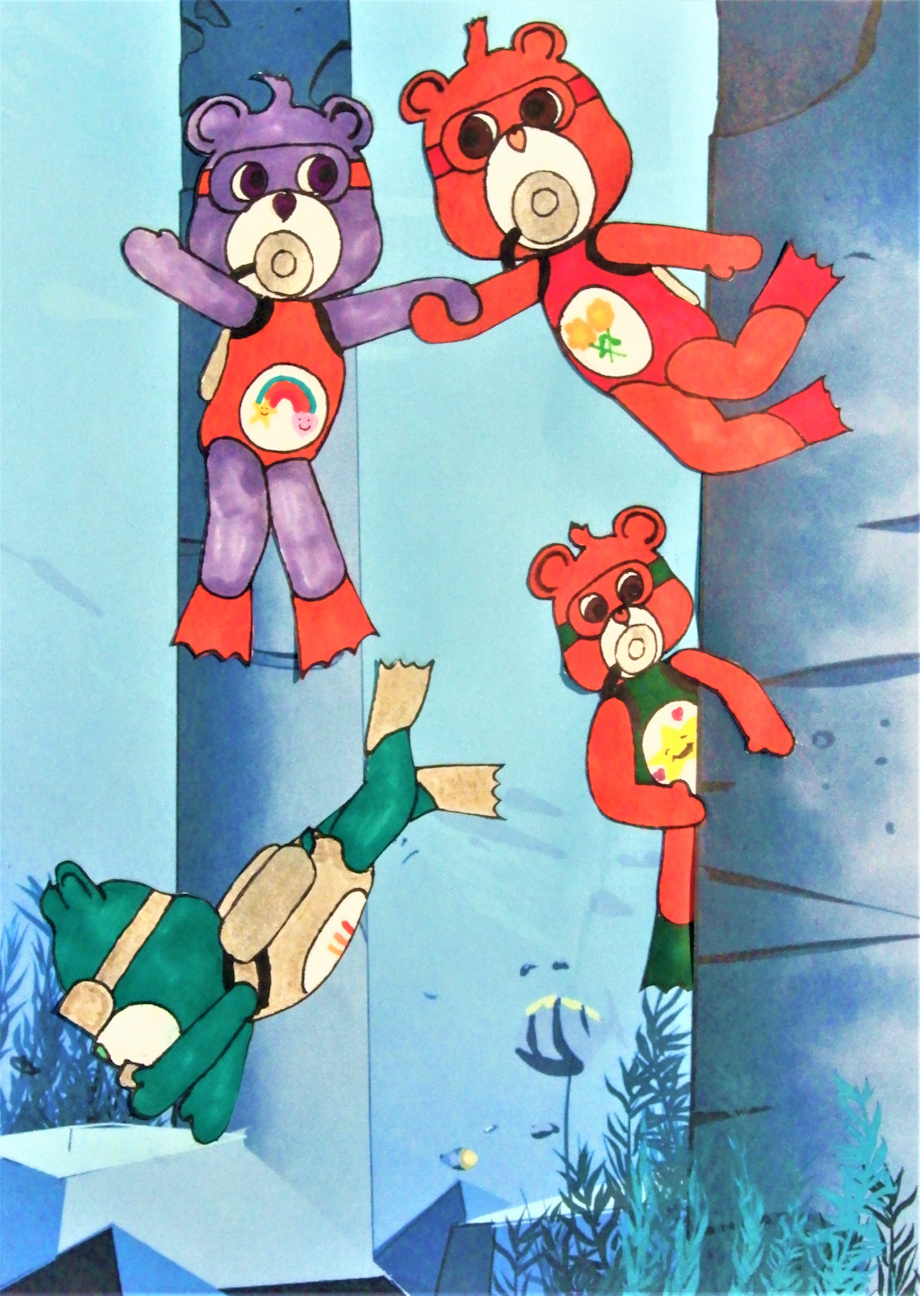 Another requested drawing for Robert-Butler featuring the Care Bears scuba diving. This time the bears are (clockwise from top left) Best Friend Bear, Friend Bear, Laugh-a-Lot Bear, and Wish Bear. Hopefully this will be the last such request Robert gives me. I shouldn't have to make artwork of the same theme all the time.