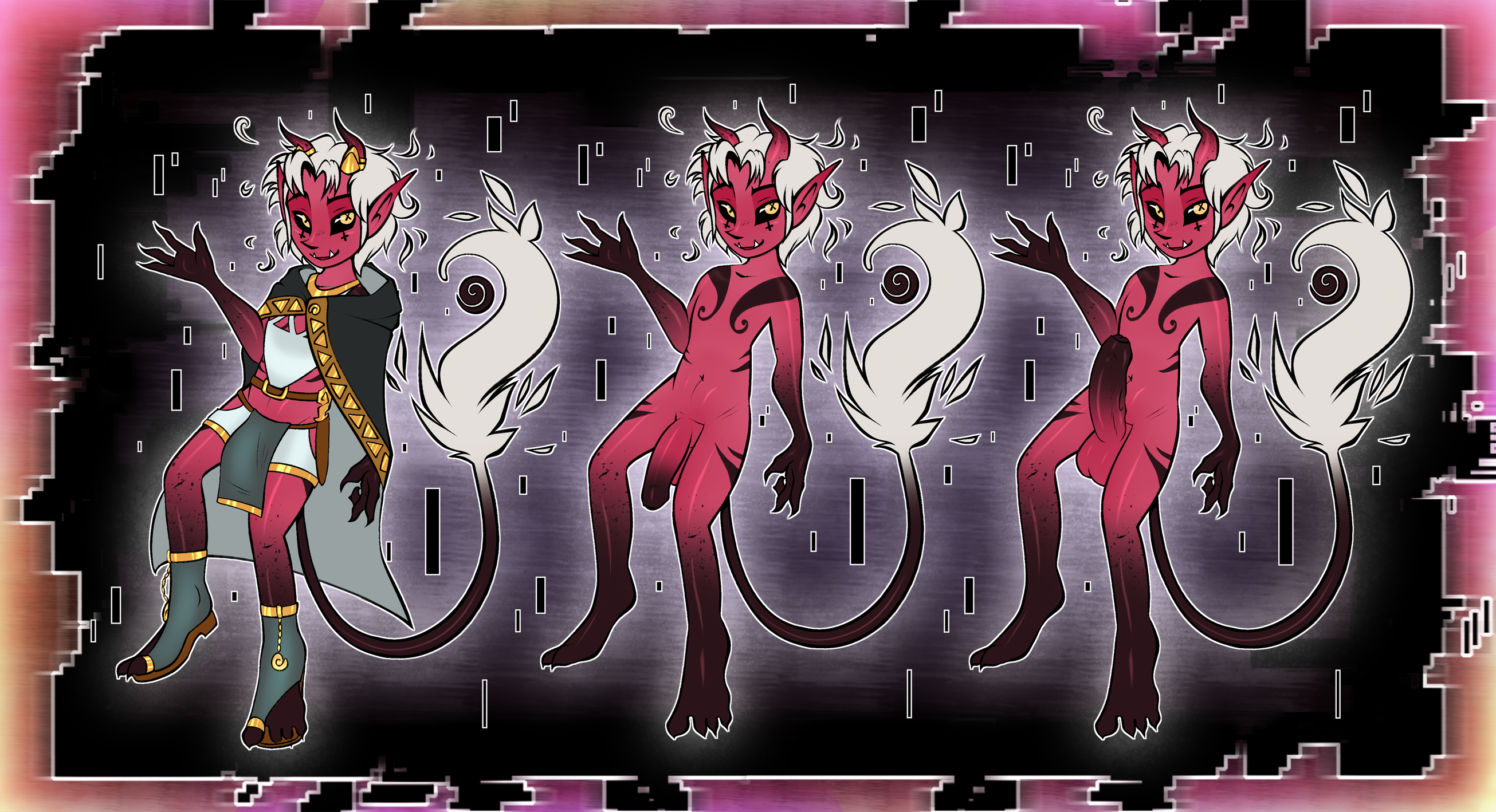 A red-skinned demon with white hair and gold eyes, his race is evident to anyone who crosses him in this form. Half demons don't possess the kind of aura someone like Cainnias possesses, but luckily incubus are masters of transformation and disguise so blending in among mortals by warping his form isn't much of a challenge.