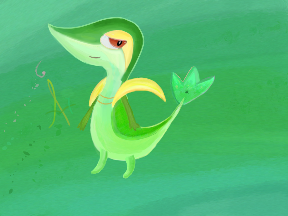 Drew this Snivy and am really happy with how it turned out overall. The tail resembles a leaf and is decorated with spirals and pretty colours, the dark green parts have been marked to resemble a little closer with a frog-like creature and the signature has a tree motif and blossoms / leaves blowing in the wind. Next time I hope I can make the legs look better.