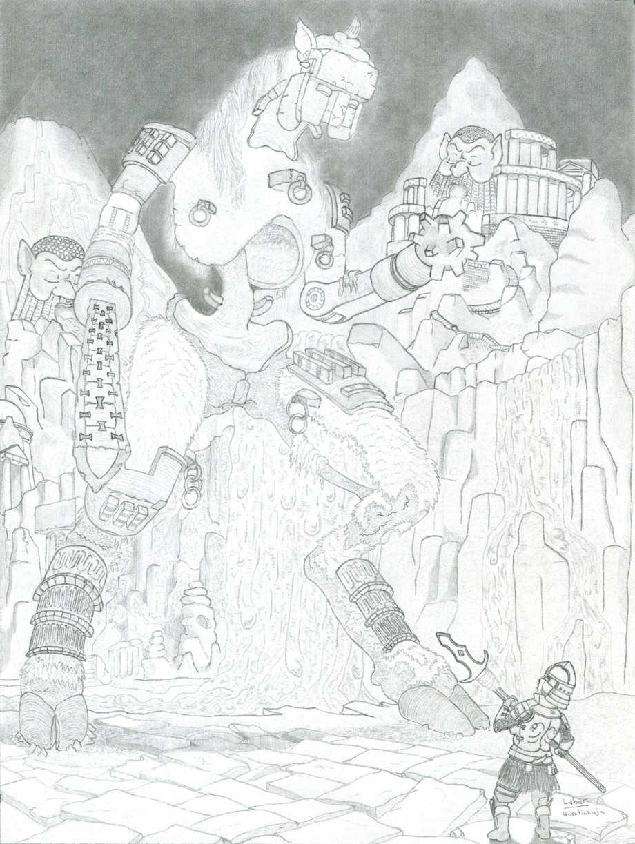 So some acknowledgments, the obvious reference for The Shoulg/ The Kavalac is Gaius from Shadow of the Colossus, the Cyclops and the stone face at the entrance of the valley from the 7th voyage of Sinbad, and the Scissors gladiator (mace head instead of a semicircular blade).