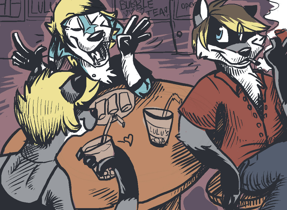 I commissioned my friend to draw a cute little scene of us having lunch, it seems I'm still smoking, Combat is too into Skye's story, which involves something with numbers. I'd like to imagine we're talking about something inconsequential rather than philosophical, in all likelihood, it would be about urban infrastructure.