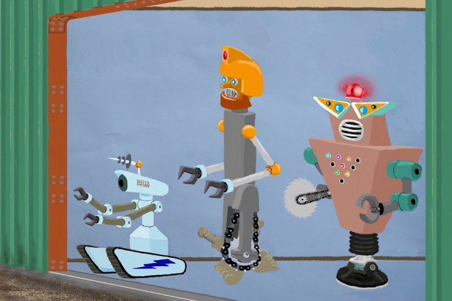 The one on the right has a chain driven buzz saw blade in place of one of the mechanical hands.
