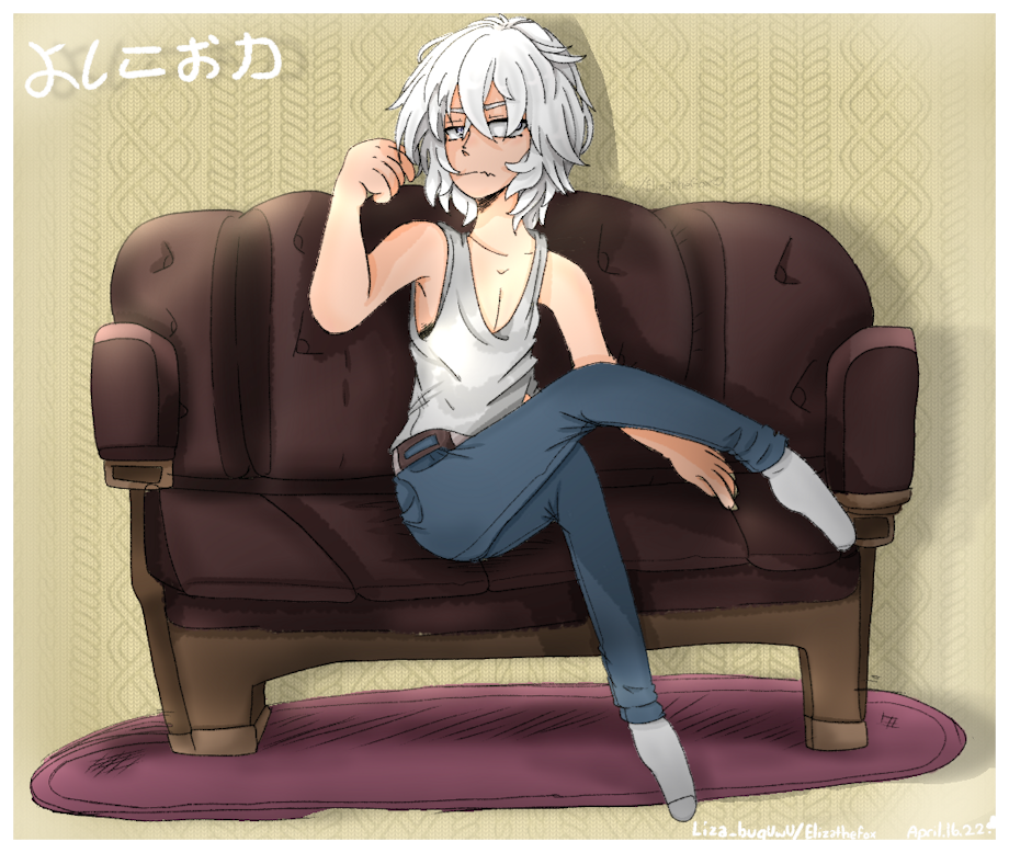 Character is a redraw of another one of my okder ocs, his name is Yoshiko(last name) Okami(first name). Anyway I wanted to try something new, he was the perfect candidate.~ I drew a snazzy couch! I must say.~ uwu.~