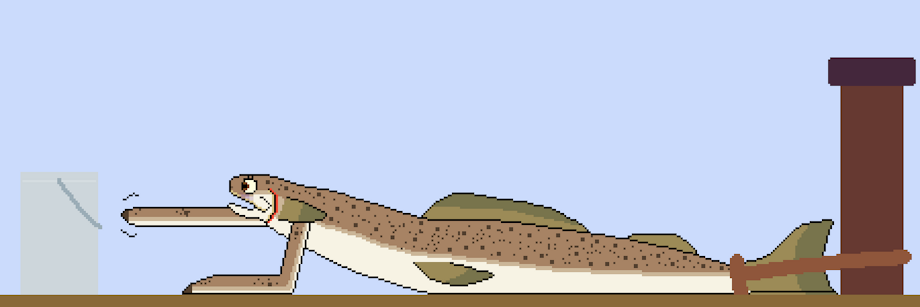 Tammy the trout has been caught by fishermen! They understand that she needs to breathe water, and left a bucket of it near her, but it's just barely too far away! They must have misjudged how far she can reach with her tail tied to that post... Or did they?
