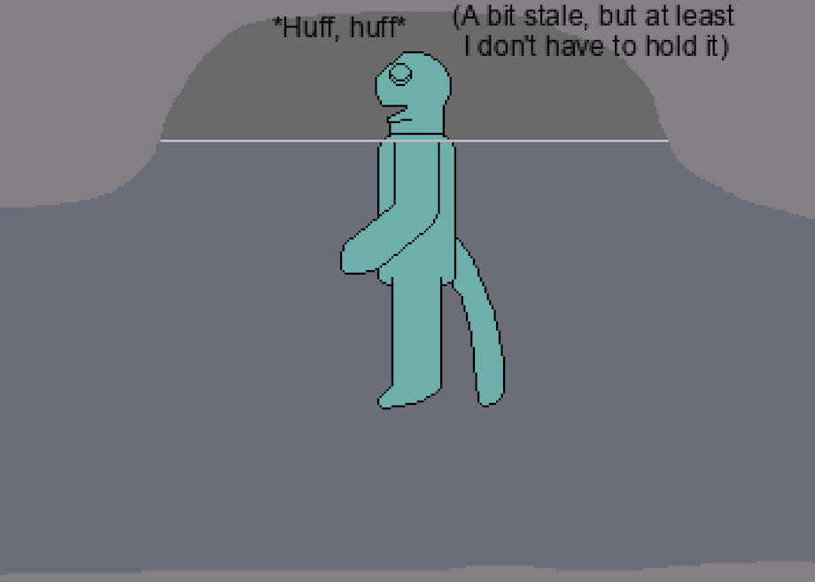 My dude here has got some hammerspace lungs, able to hold in way more air than it seems like he should. He can exhale enough for a sizeable air pocket in one go, rest his lungs in it for a while, then just suck it all back up and keep swimming. Even this much air is only about a fifth of what his lungs can hold!