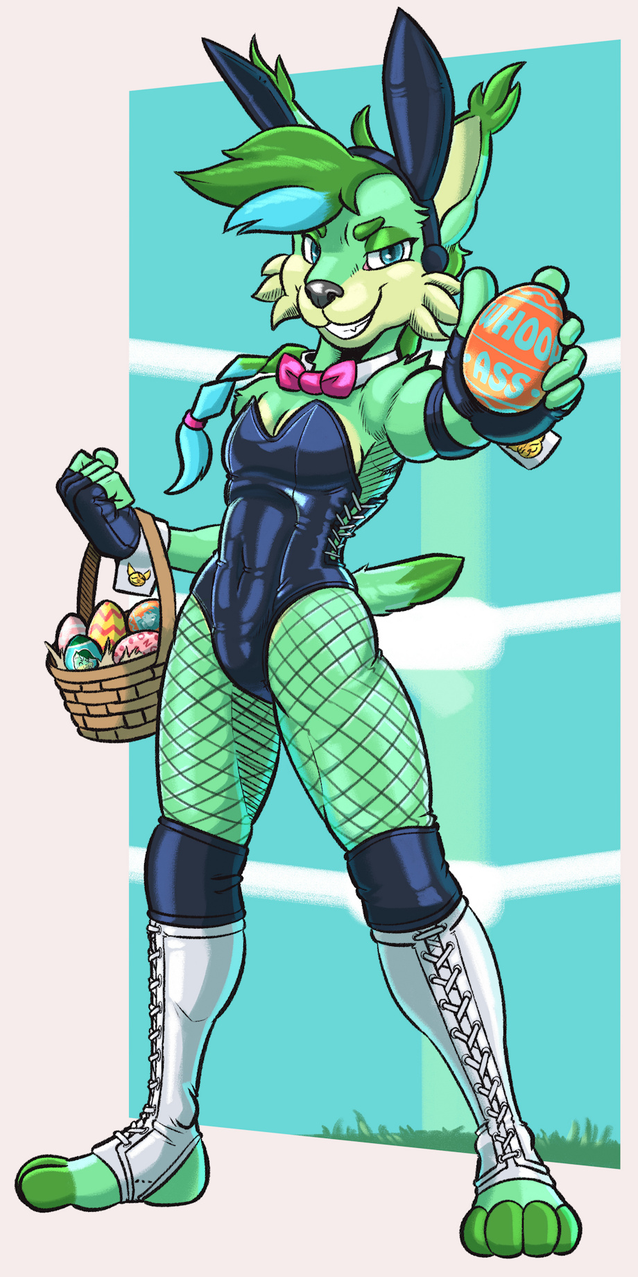 's Aria in a wrestling-style bunny suit, ready to crack open an egg of Whoop-ass, so to speak.