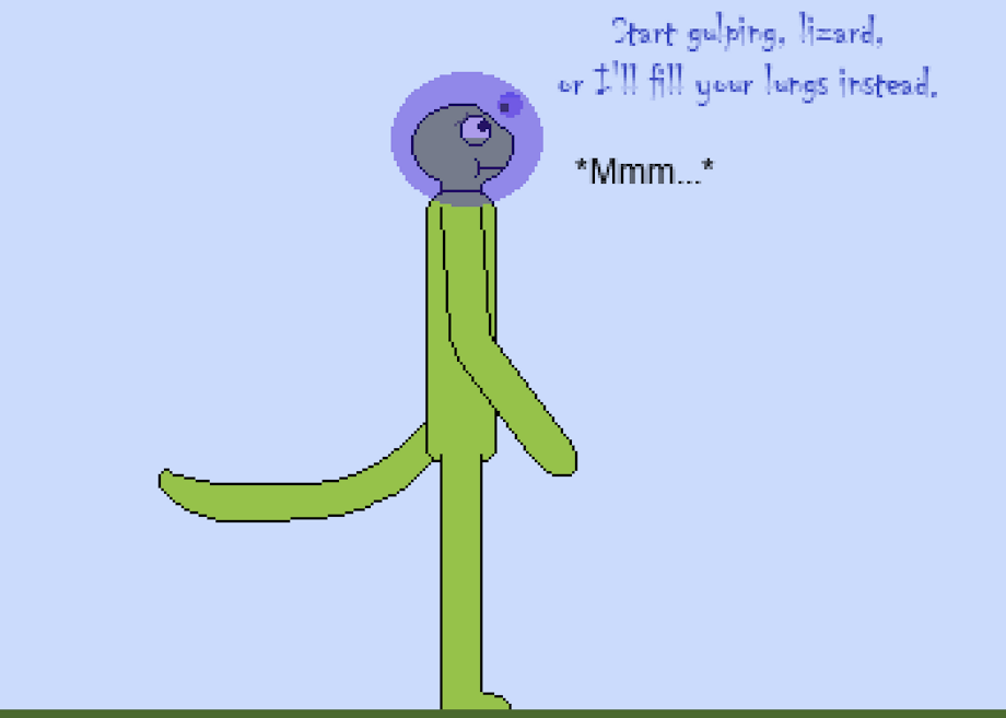 What's an air-breather to do, with a sentient ball of goop attaching itself to their head and demanding to be swallowed? He can't pry it off, and it's keeping him from breathing, so he'd better think of something soon! Though, he could always just give in, and gulp as much of it as his belly can hold, but it'll probably taste awful and make him sick...