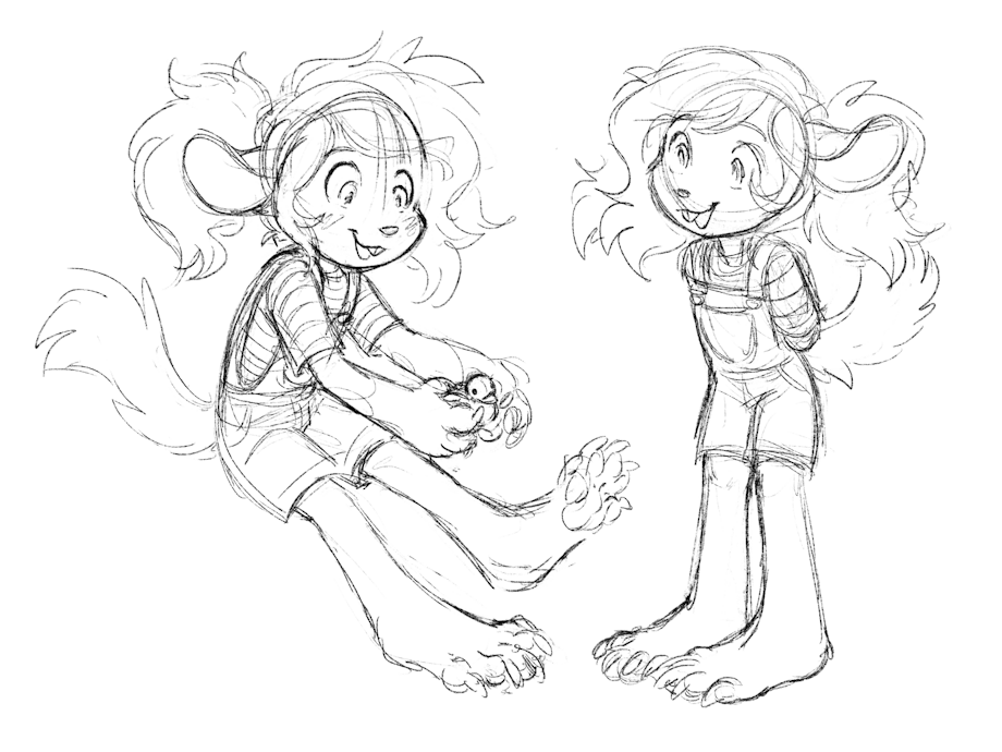 some more recent doodles of katie. i've been experimenting with style, i favor a more tapered-style of limbs as of late so i've been trying to apply that to her! higher up pictures are more recent, lower older